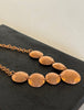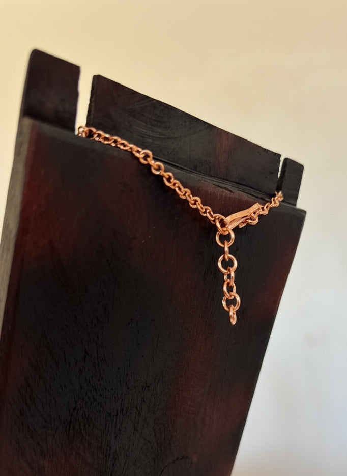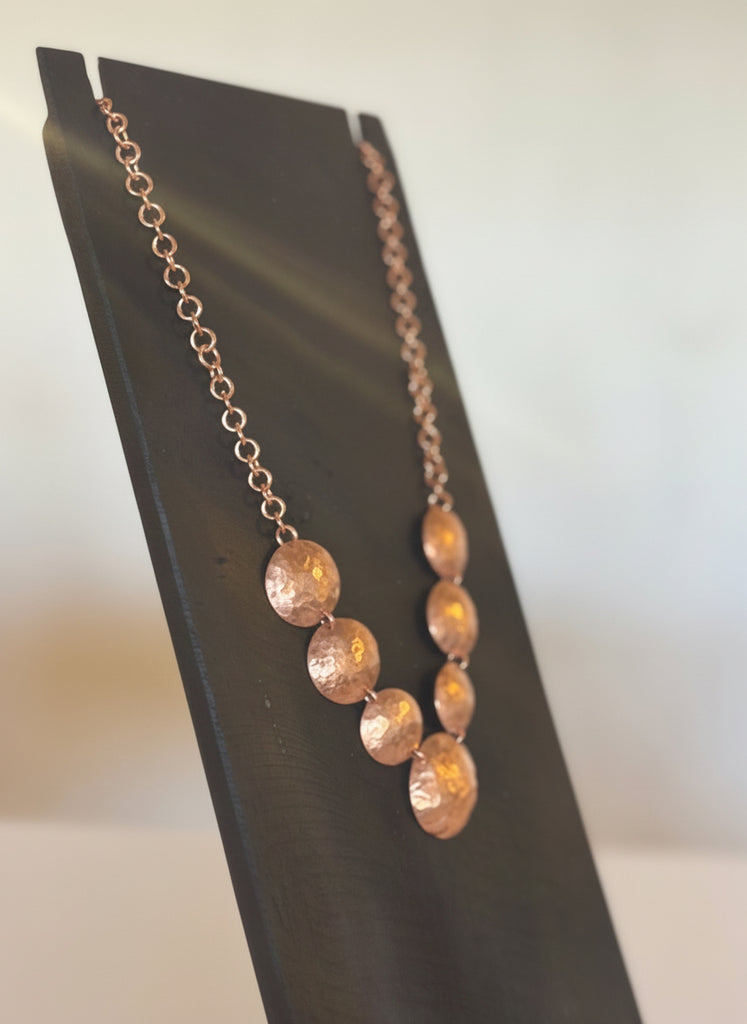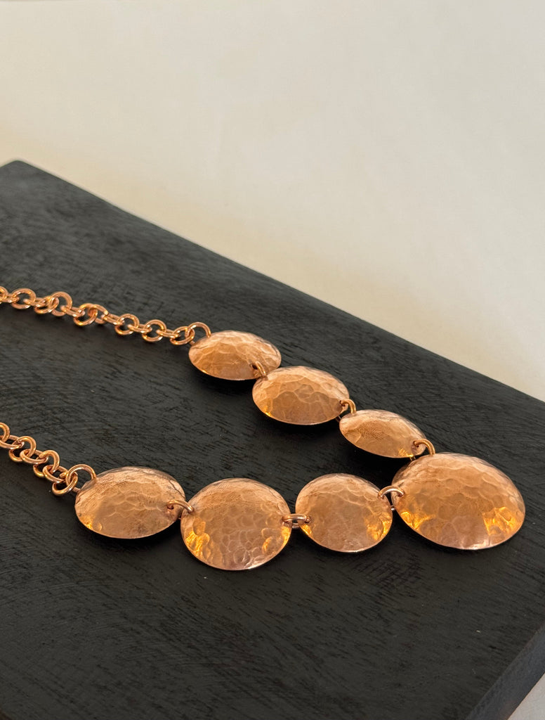 A striking yet understated piece, this handmade copper necklace features a row of hammered circular discs that catch the light with every movement. Each disc is shaped and textured by hand using up-cycled copper reclaimed from old hot-water geysers, giving the material a renewed purpose and a warm, natural finish.
