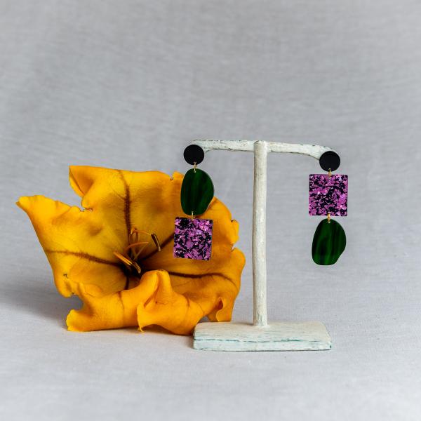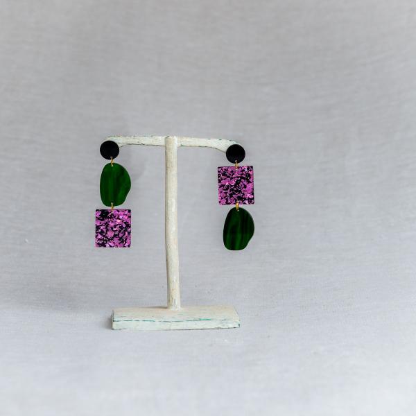 Disco purple and stone green, with small black stud. Mismatch square and oval