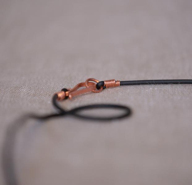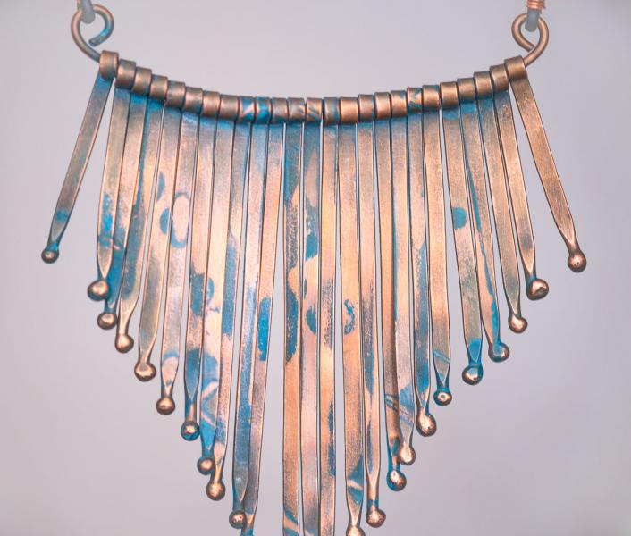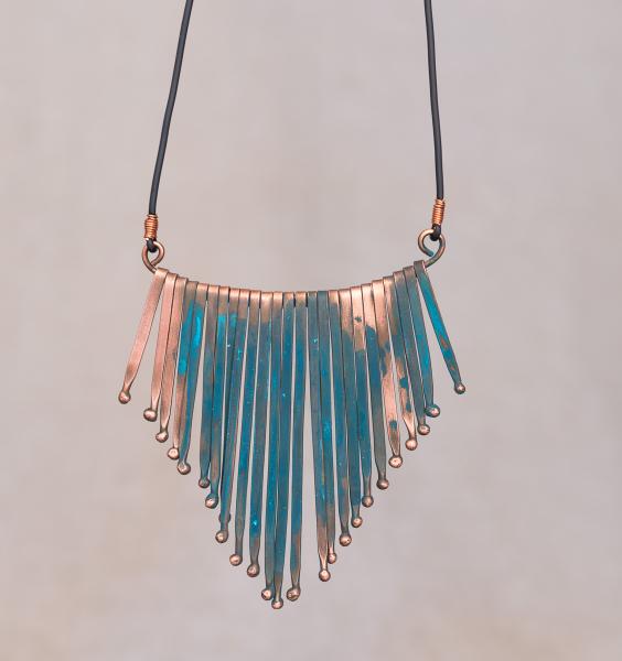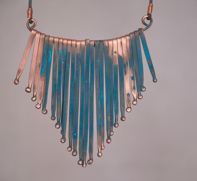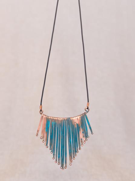 Handcrafted by young self-taught Zambian woman of F.R.E.E. (Foundation for the Realisation of Economic Empowerment) A design made from start to finish with a creative and artistic soul in mind. Each strand is individually hammered and moulded from recycled copper heaters and wire. Thereafter a patina treatment is applied to give it a vibrant turquoise colouring one that would add an individual touch to your wardrobe. Hung from a rubber cord with a copper clasp.