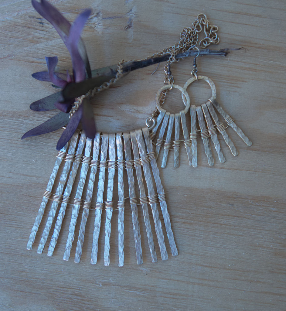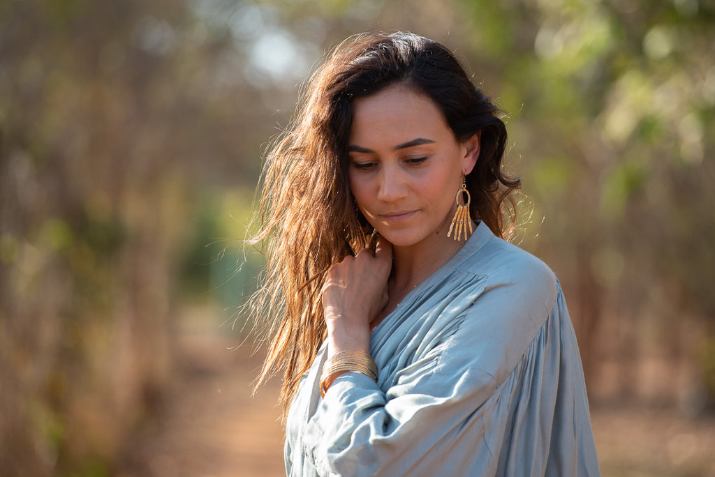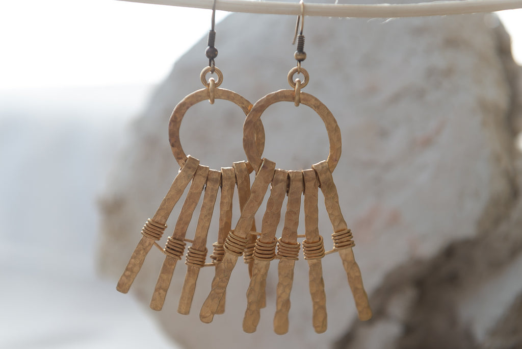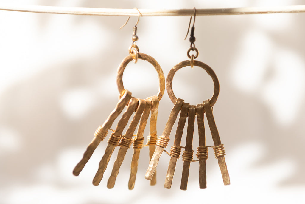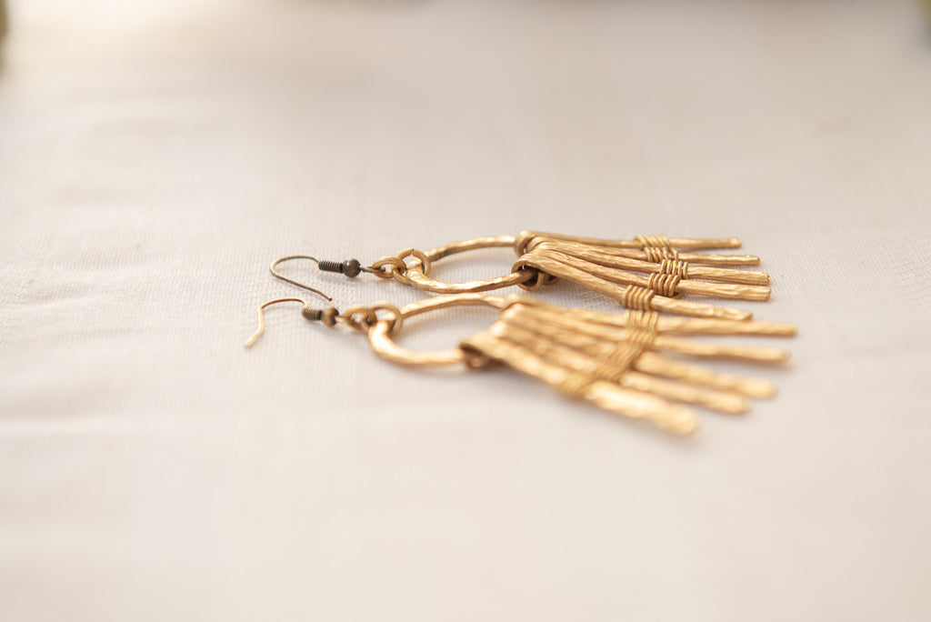 Crafted with ingenuity, these earrings draw inspiration from the traditional "mbira" musical instrument, with each strand is skilfully hammered and moldded from up-cycled hot water heaters (geysers). Originally copper, they undergo a transformative journey to emerge with an elegant gold-plated finish.