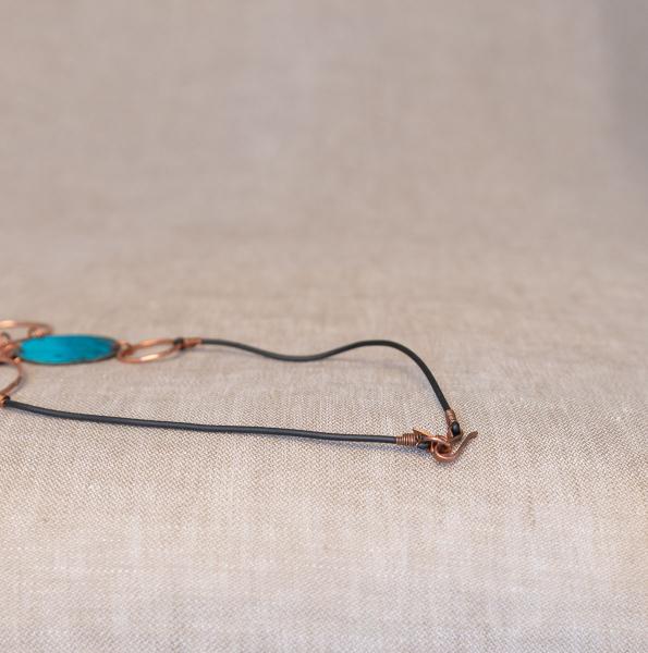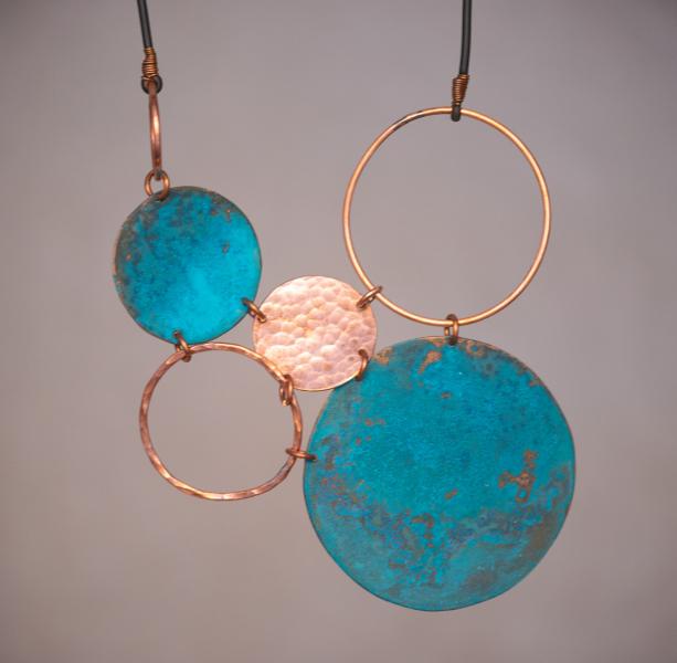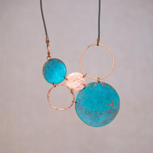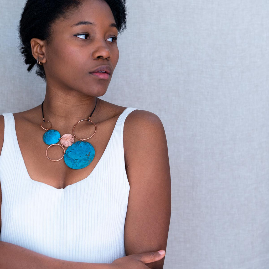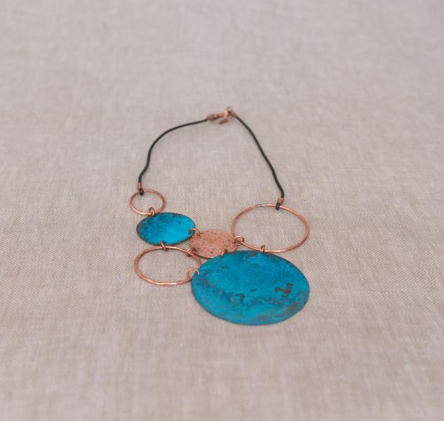 African hoopoe necklace known as the bird of sacred beauty. Noticeable for their distinctive crown of feathers symbolises this eclectic designed necklace made from recycled copper and additional patina- the treatment responsible for the vivid turquoise seen on the larger linked flat circular discs. Handcrafted copper-patina round disks with hoop necklace, each piece is handmade including the links. Hung from a rubber cord and adjustable link with clasp.