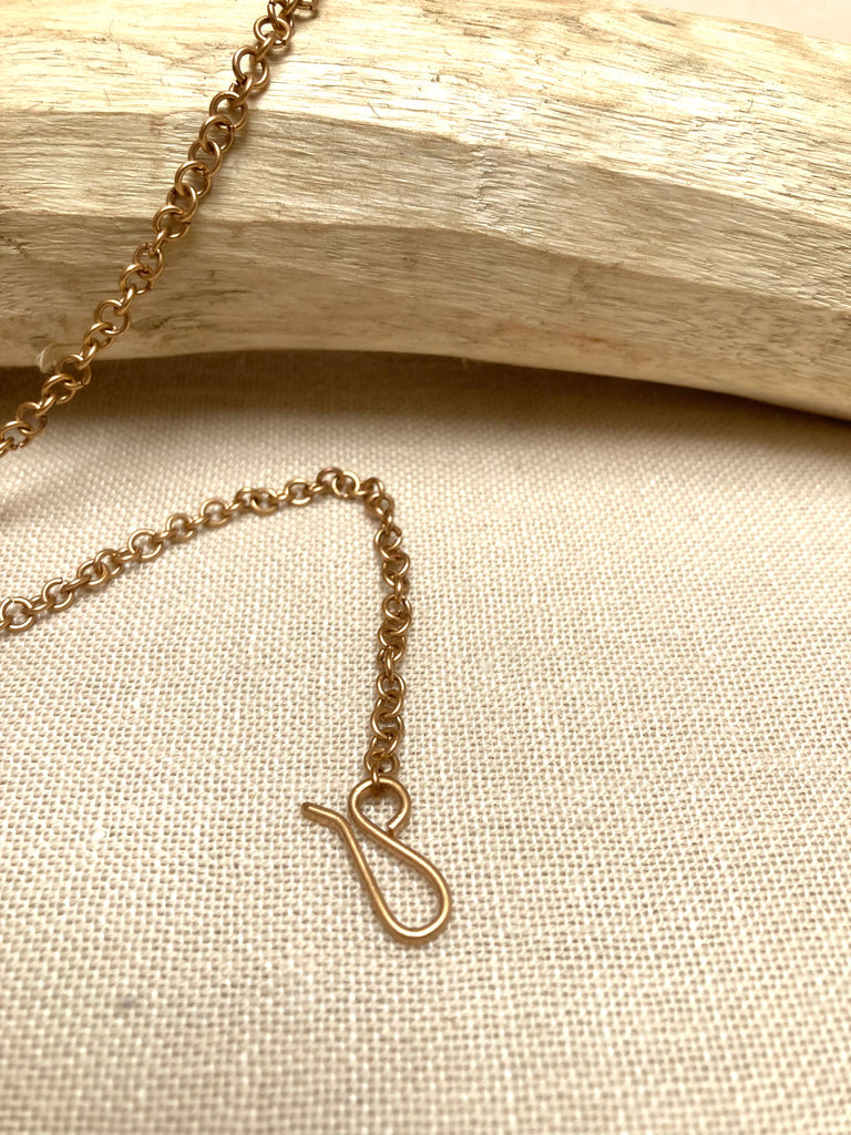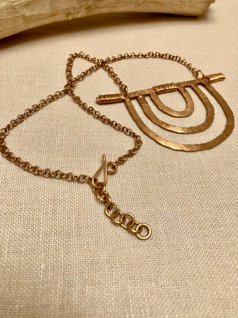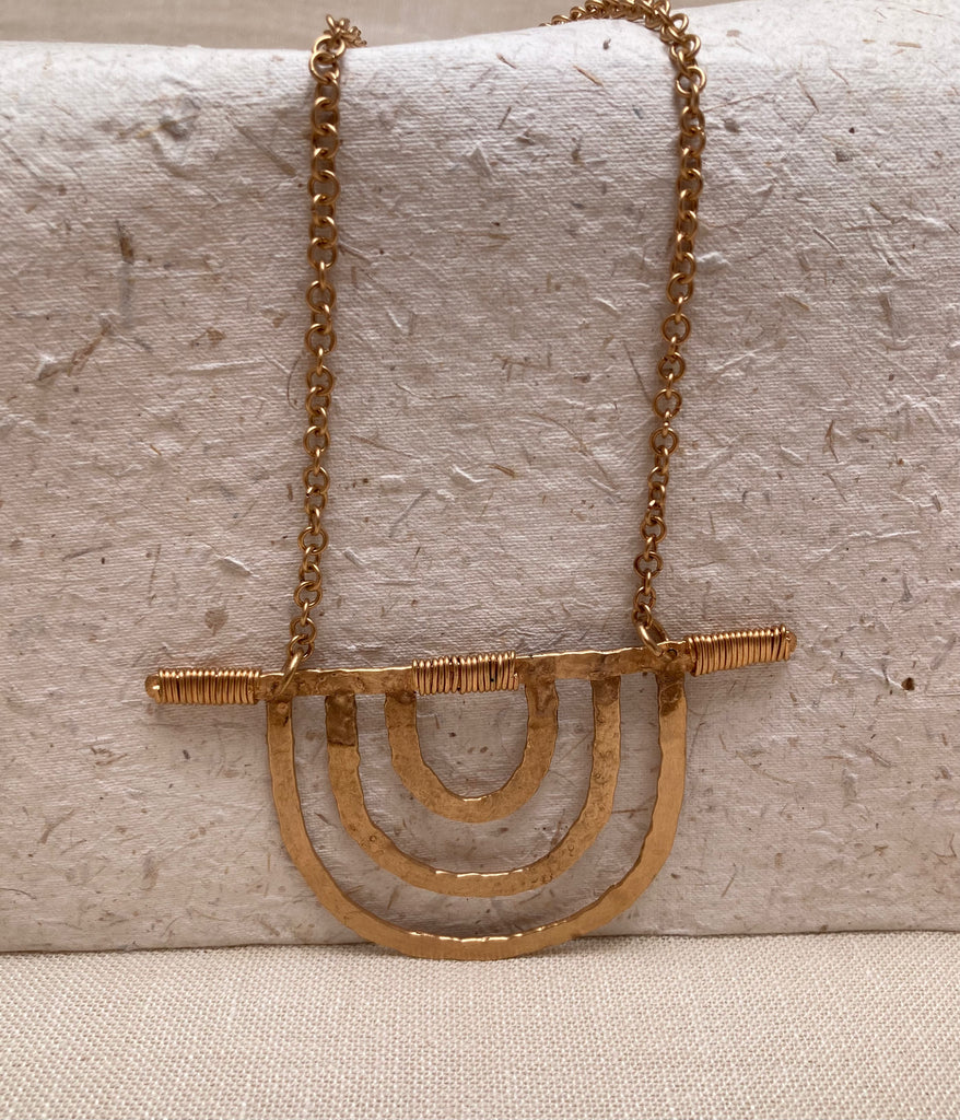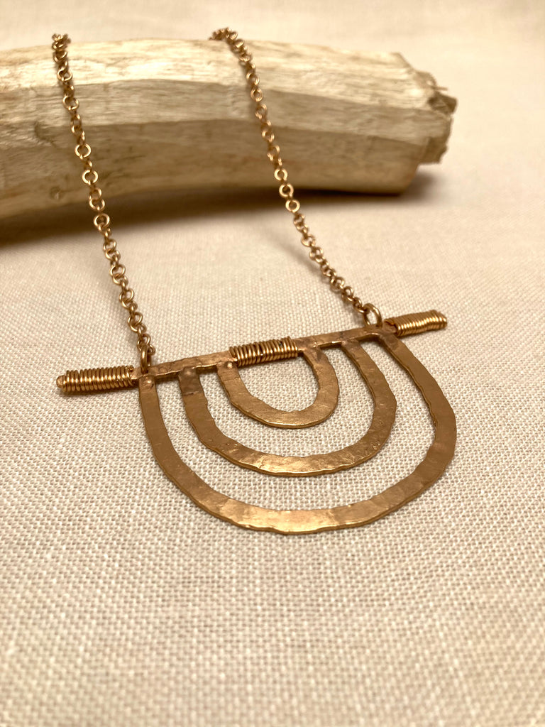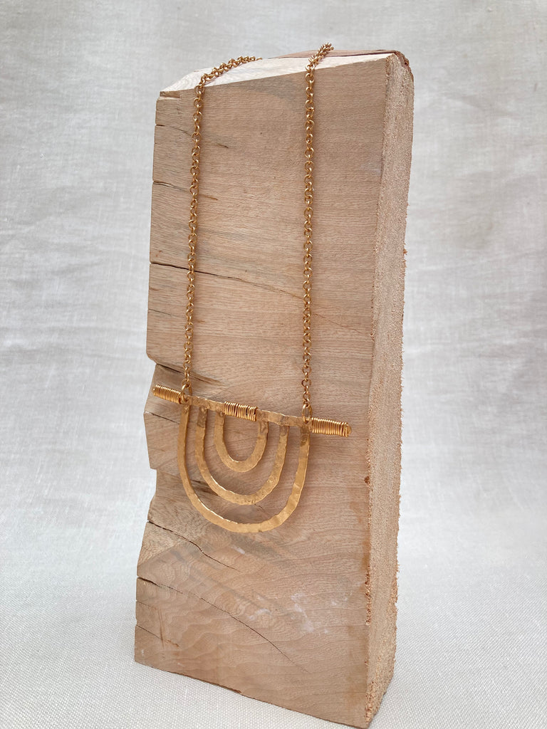 The sunrise necklace has a half circle hammered bar detail with wire wrapping