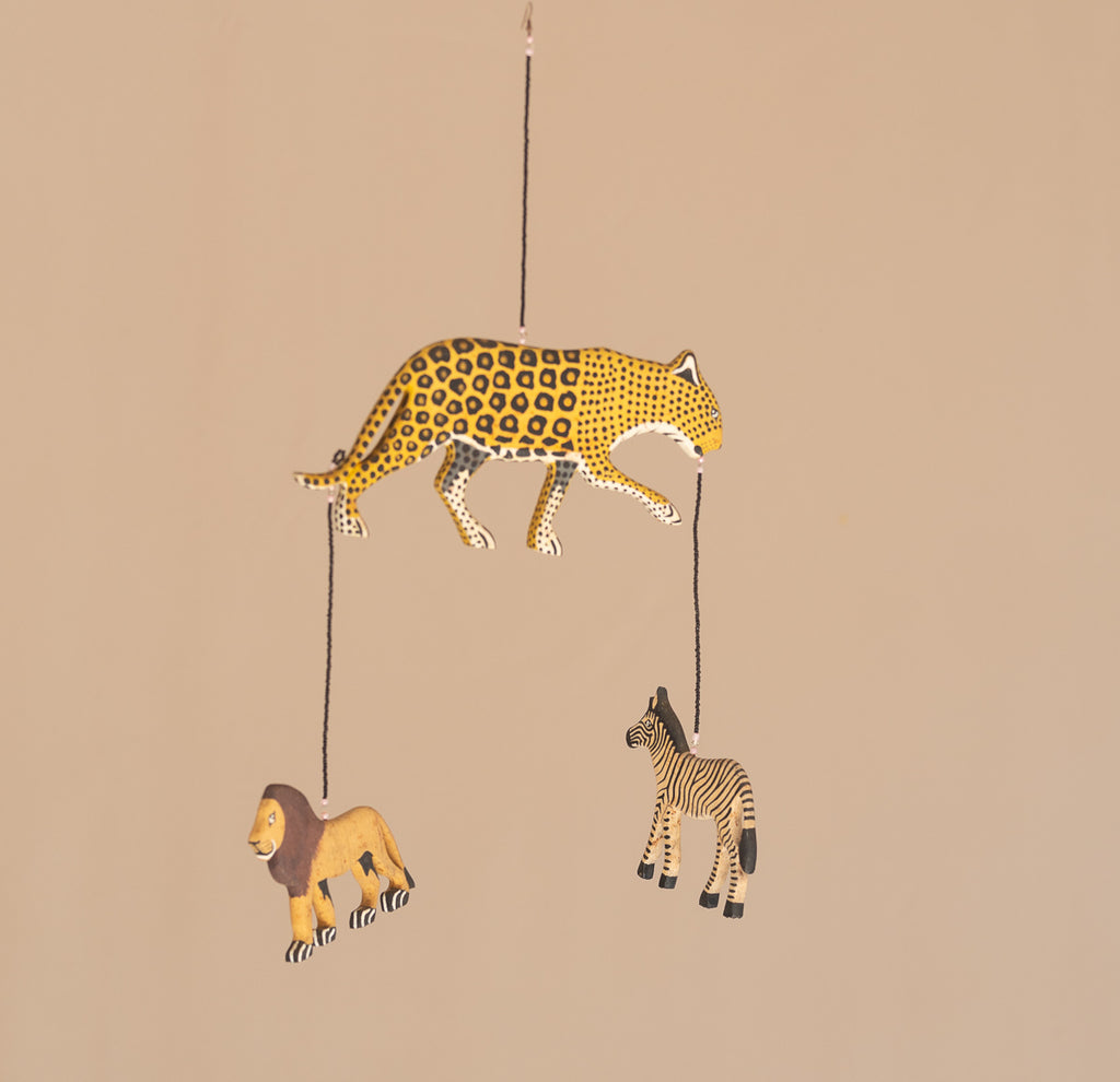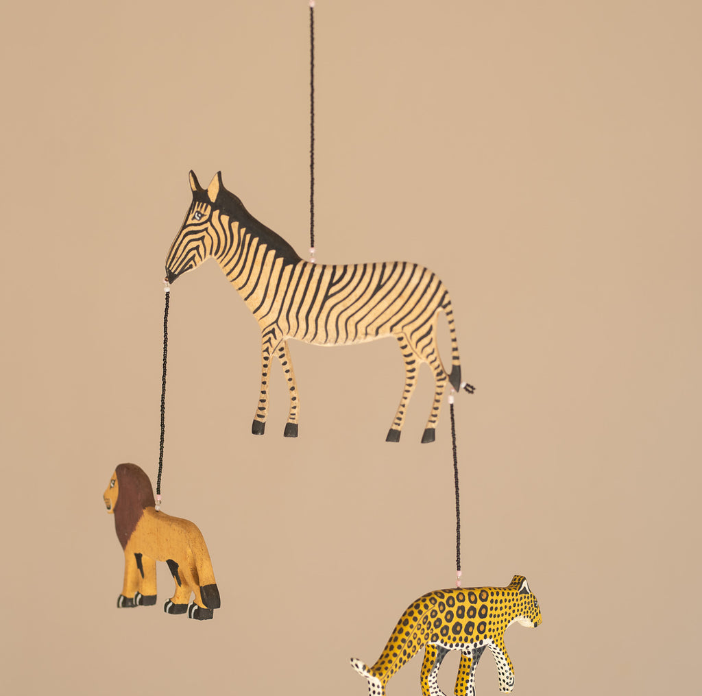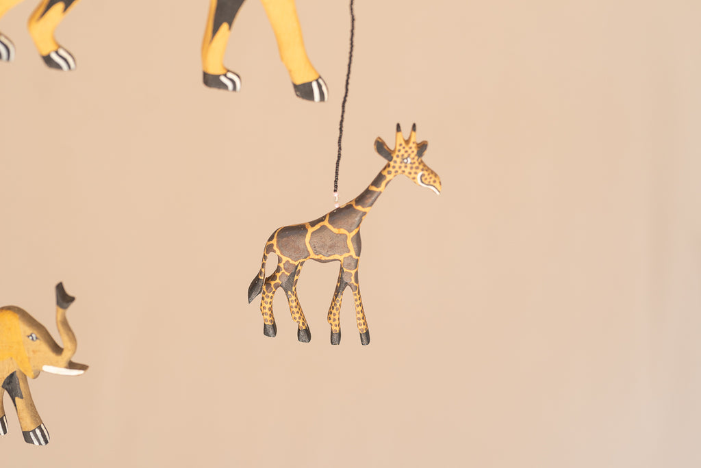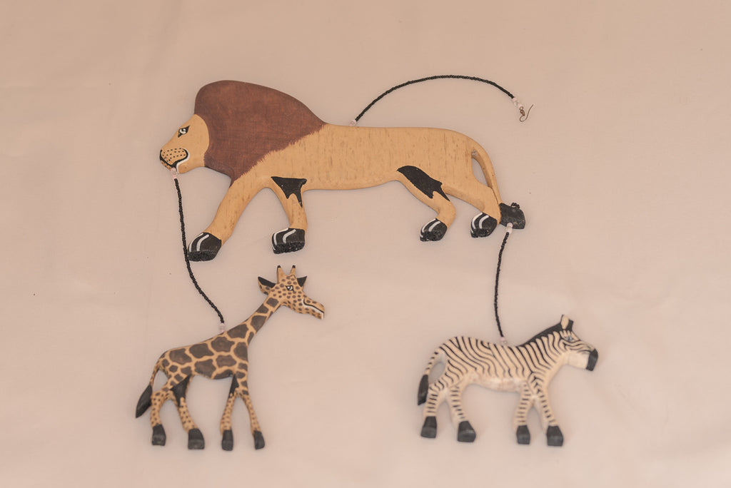 Hanging hand carved wooden mobile showcasing African safari animals. Mobile includes various sets of animals of which some include giraffe, lion, zebra and elephants. Perfect colours and each piece is hand painted to add a gentle interest to a variety of decor tastes. Best present for your new child or for a baby shower. Each mobile has hook attached for easy hanging. Please hang out of your infants reach for safety. These mobiles work hanging flat against the wall for a hanging piece of wall art not only suspended above a cradle... Suitable for a range of ages.