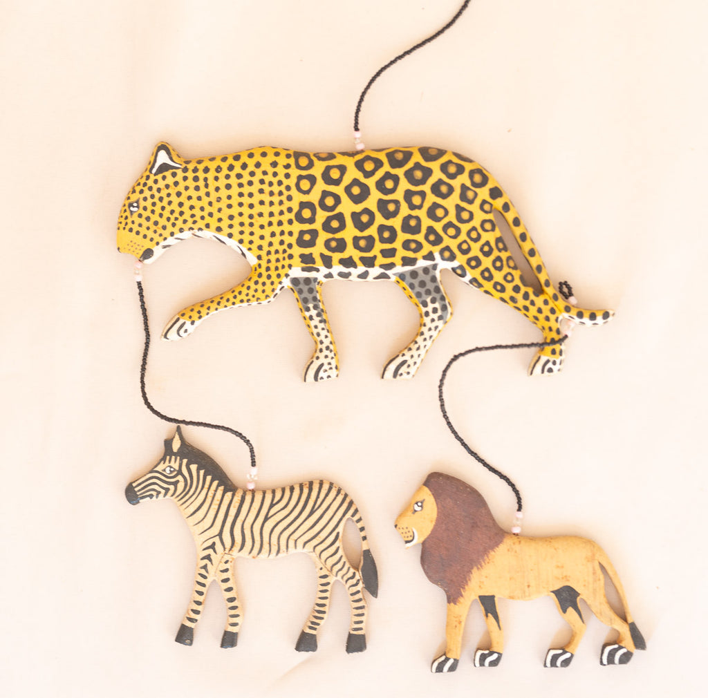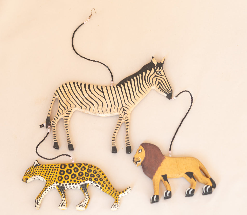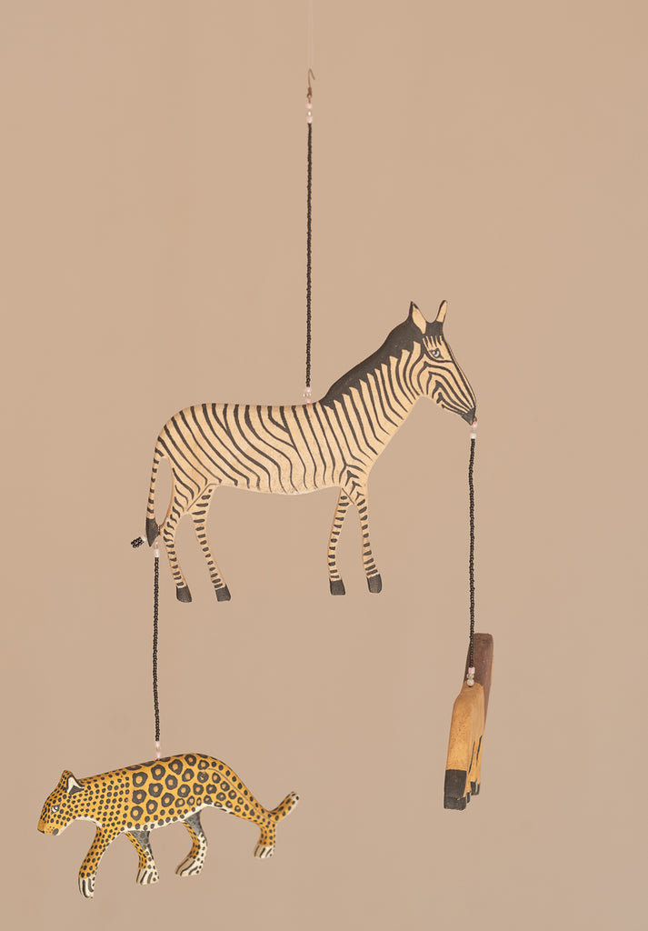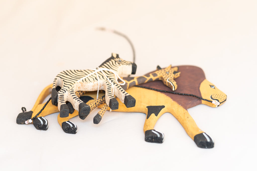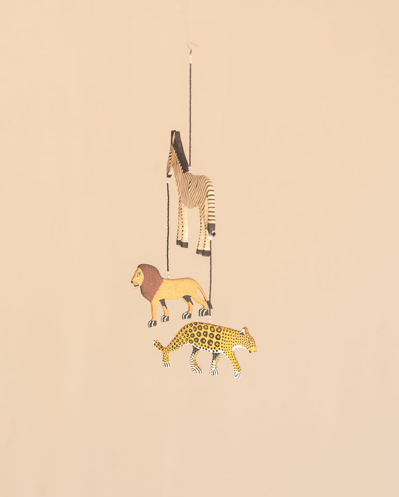 Hanging hand carved wooden mobile showcasing African safari animals. Mobile includes various sets of animals of which some include giraffe, lion, zebra and elephants. Perfect colours and each piece is hand painted to add a gentle interest to a variety of decor tastes. Best present for your new child or for a baby shower. Each mobile has hook attached for easy hanging. Please hang out of your infants reach for safety. These mobiles work hanging flat against the wall for a hanging piece of wall art not only suspended above a cradle... Suitable for a range of ages.