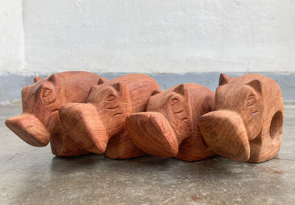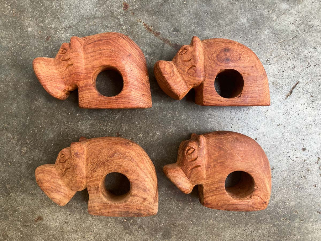 Hand carved African animal napkin rings - Set of 4 African safari animal wooden carved napkin holders. These hand-carved napkins rings will make a unique and lovely addition to any table. The set of four can also be used as name holders. Beautifully hand carved from ethically sourced wood, every stage in the making of this beautiful art involved human hands. The artisans work side by side using only basic hand tools to shape each piece.
