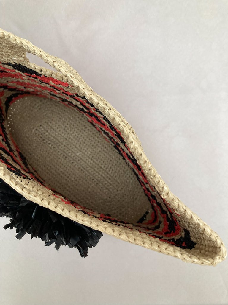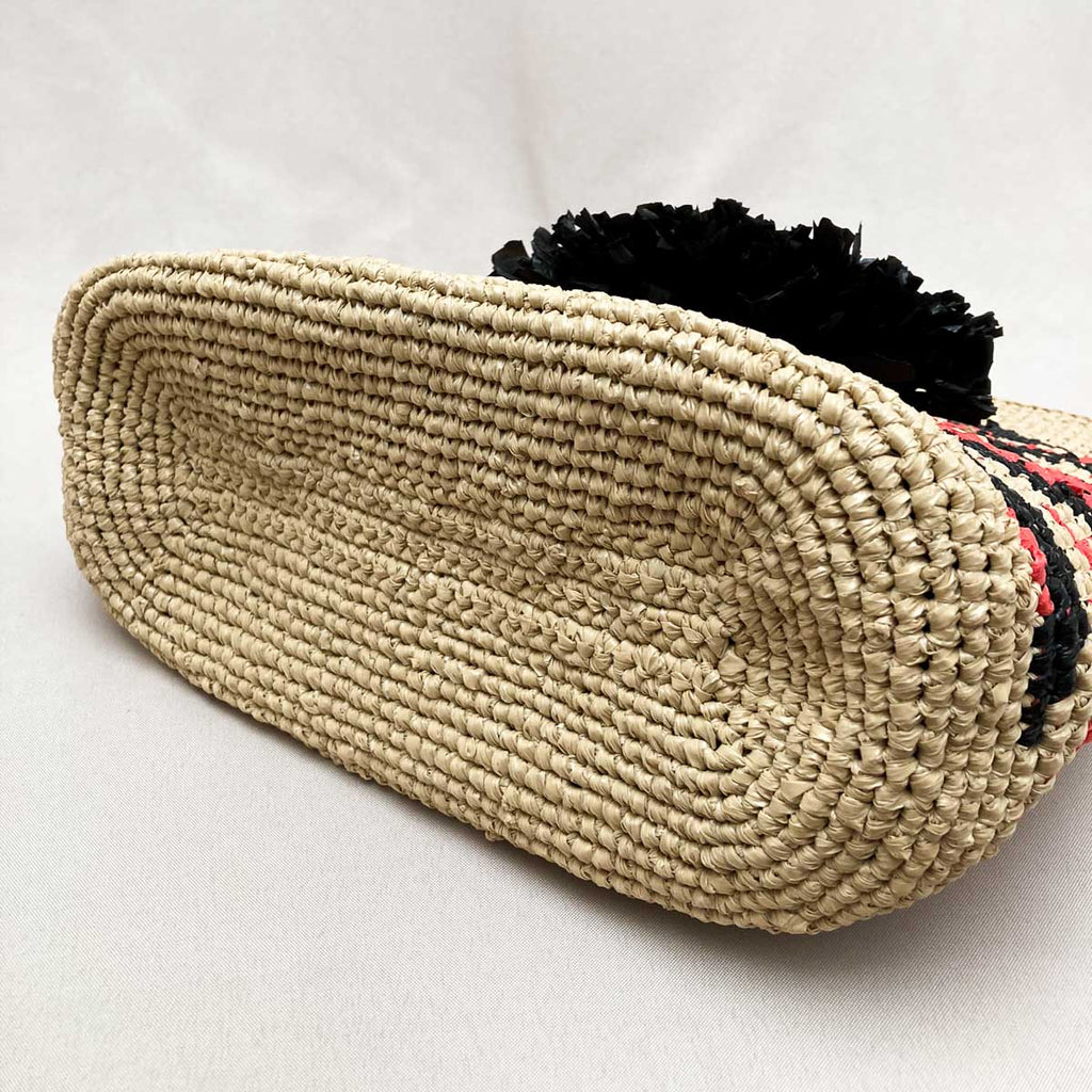 The body of the bag is crocheted from plastic strips and measurement details as follows with a self fabric handle clutch
