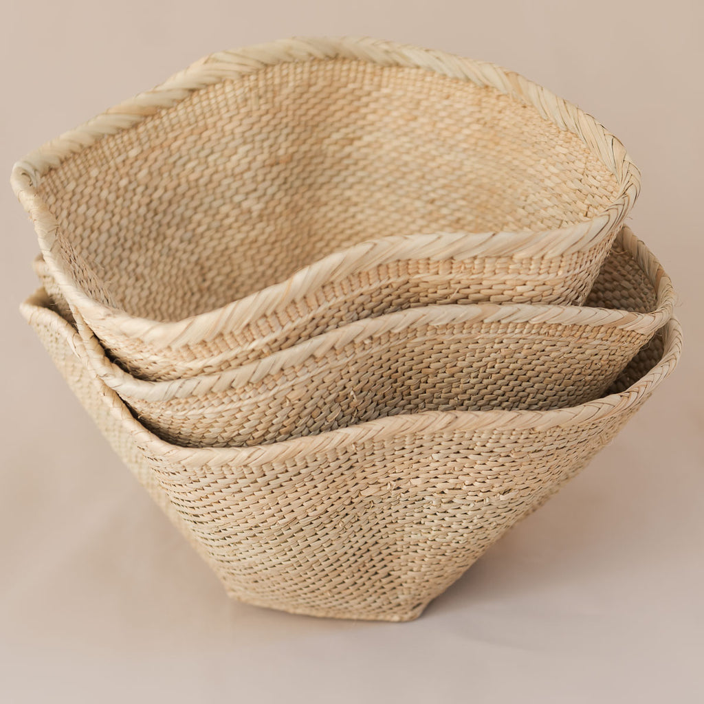 The perfect decor basket accessory for a natural accent that brightens the room, our ilala dancing baskets strike the perfect balance between casual and refined. Each is masterfully handwoven to showcase the rich texture of the dried palm vine and wild grass. A unique scalloped shape signifying the waves of the Zambezi river.